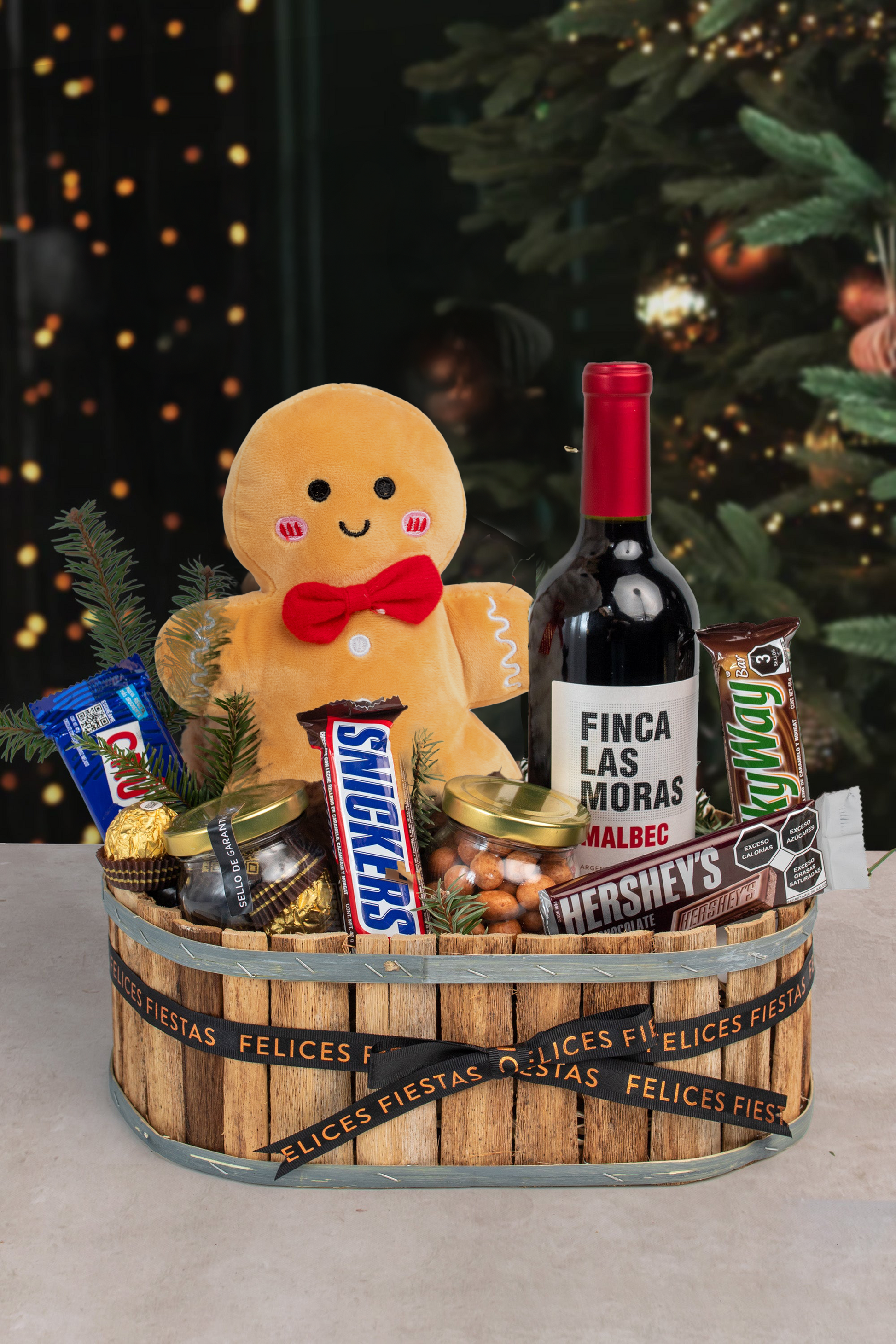 Con este regalo el Año Nuevo comenzará con alegría. Esta canasta navideña contiene un peluche adorable de galleta de jengibre, junto con vino tinto, deliciosos chocolates y cacahuates japoneses que deleitarán el paladar. Disfruta de la ocasión y regala alegría con esta canasta navideña.