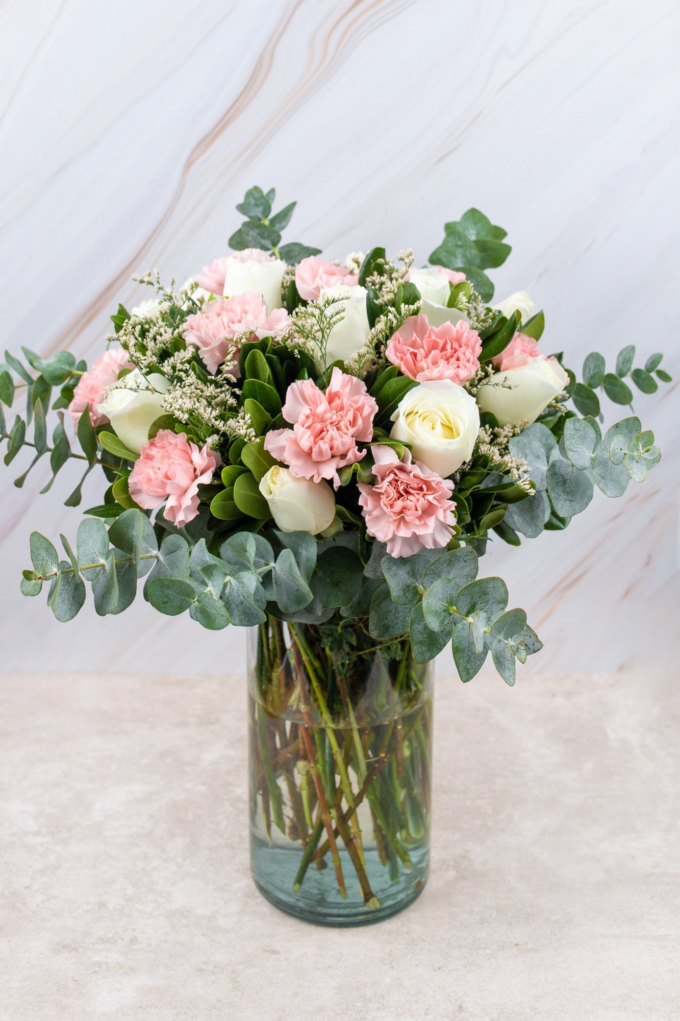 - Flowers it contains: Pink Carnation, White Montecasino, White Rose, Japanese Clove, Dollar.