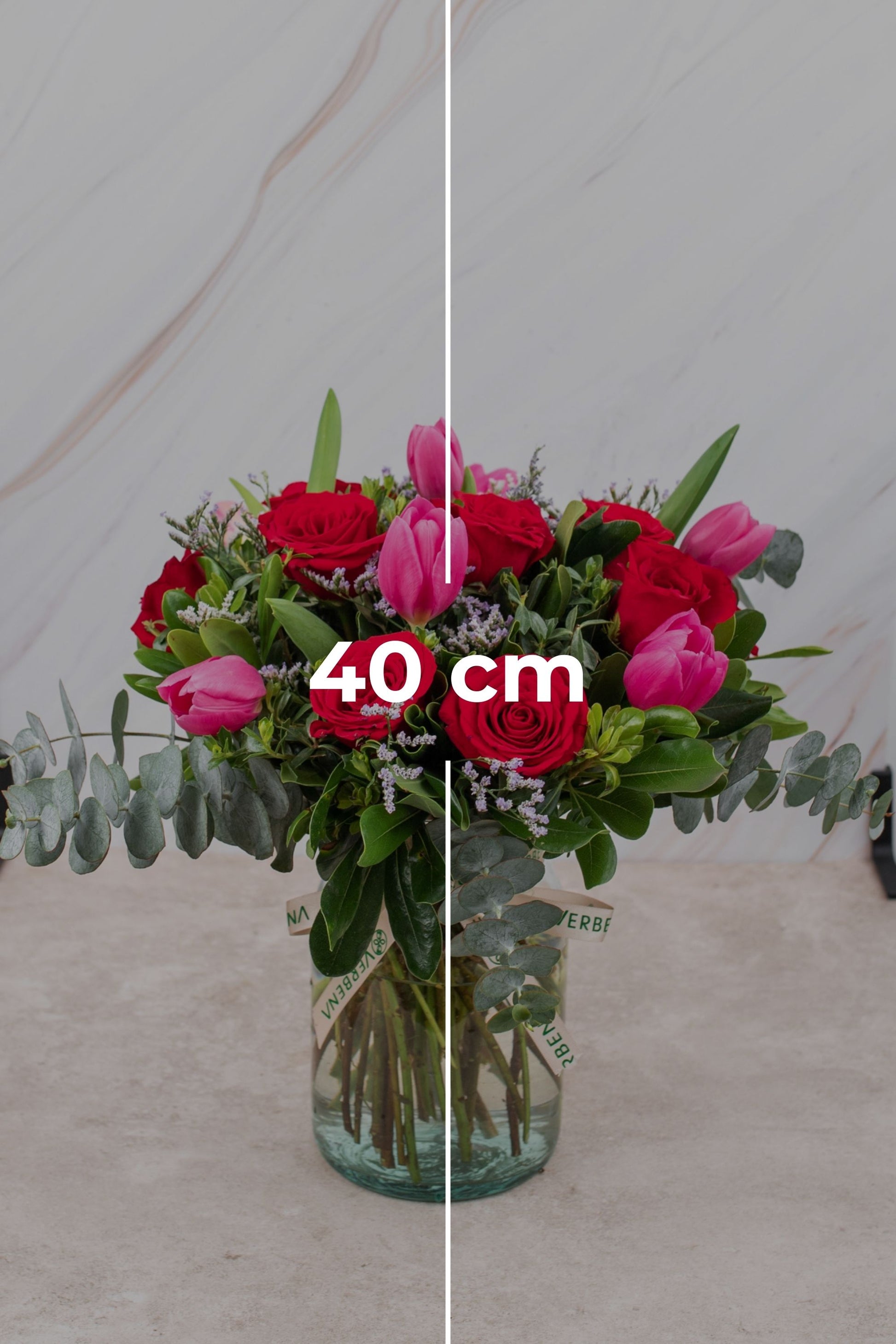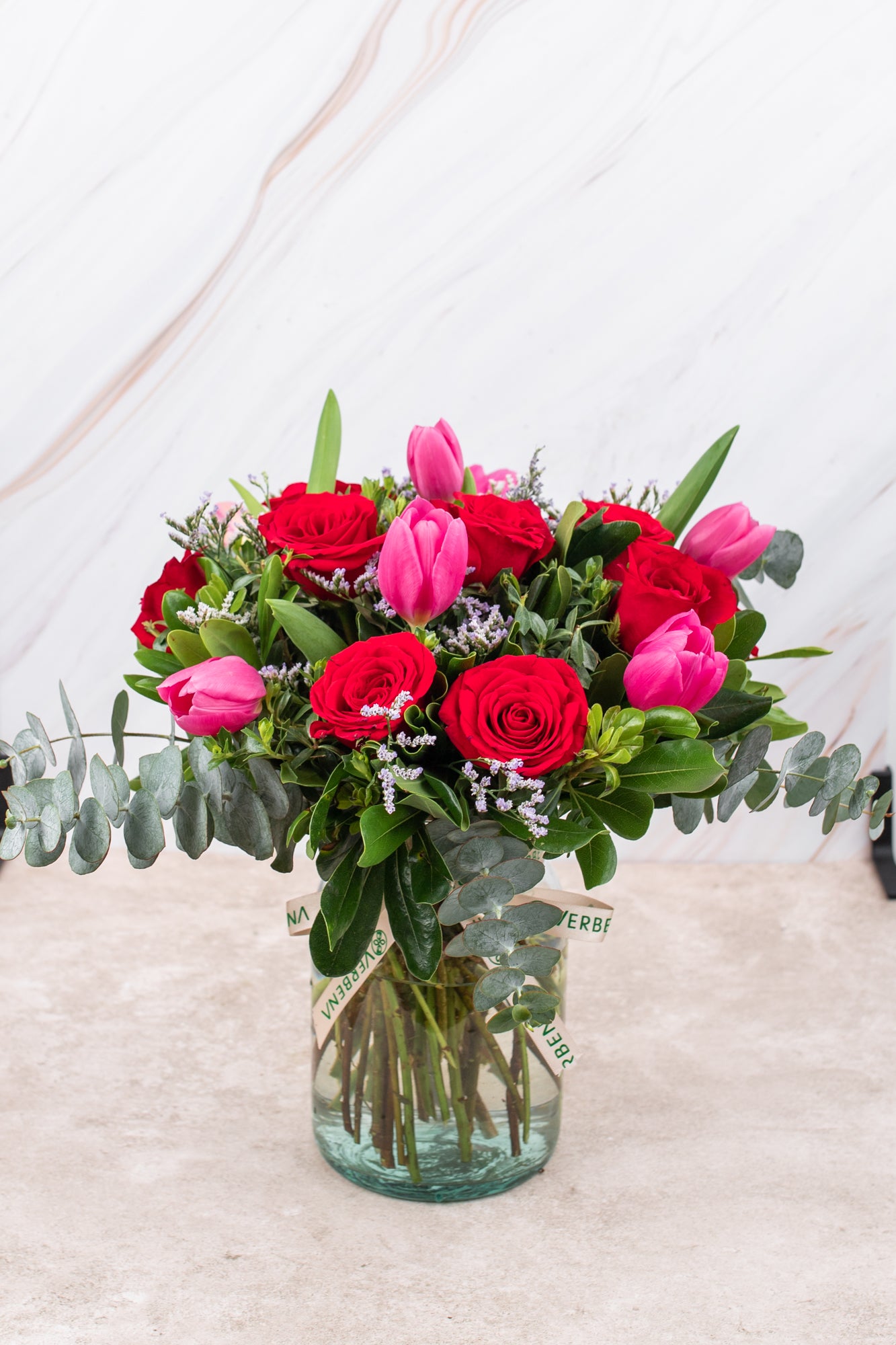 - Flores que contiene: Rosas Rojas, Tulipán Rosa, Dólar y Clavo Japonés.
