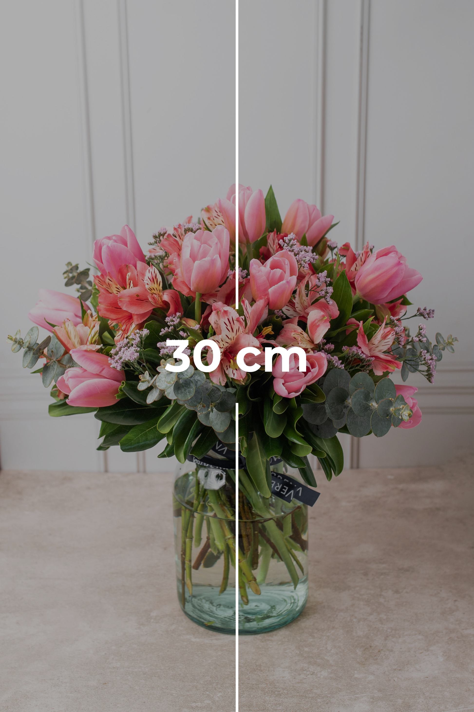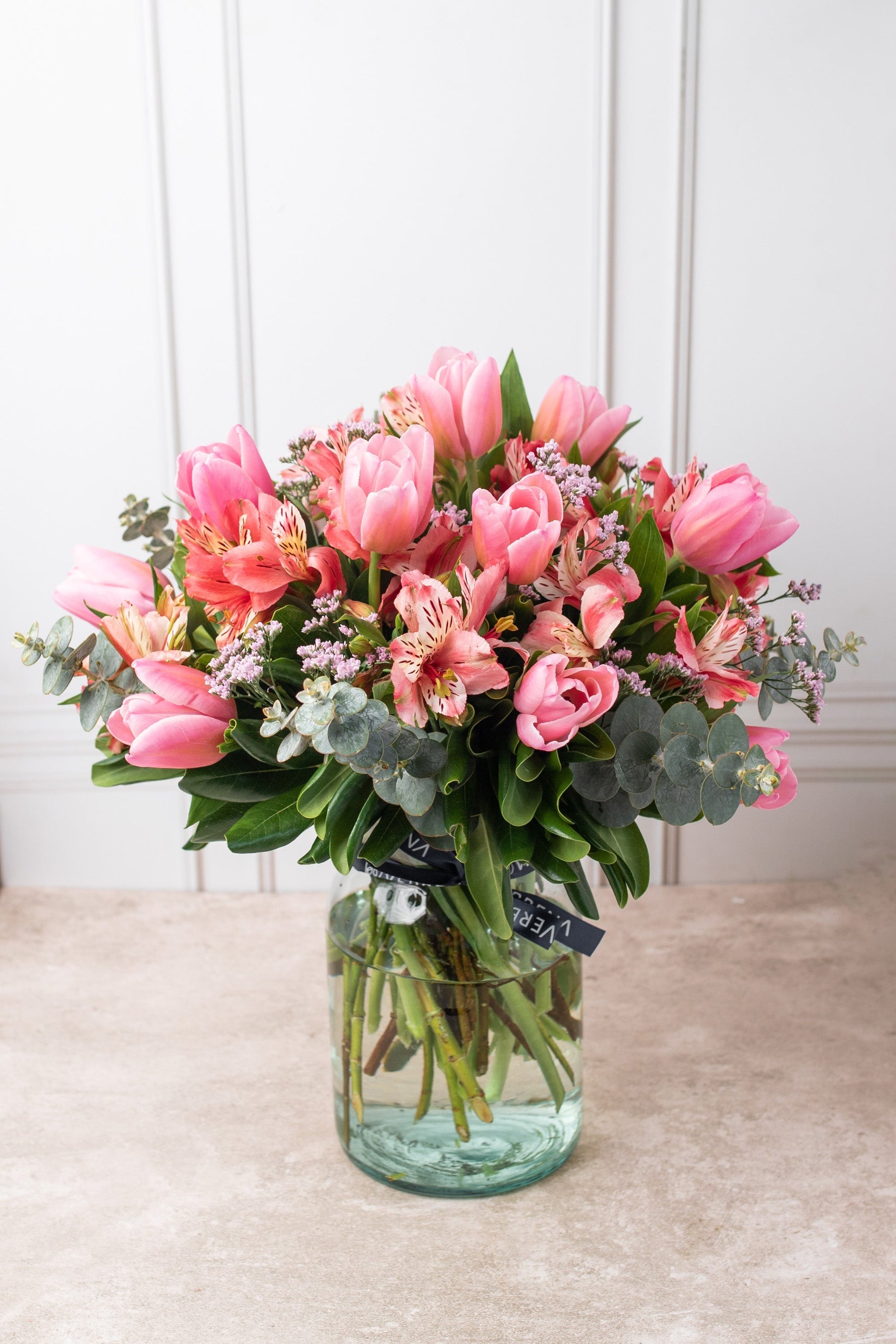- Flores que contiene: Tulipán Rosa, Alstromelia blanca, Dólar y Clavo Japonés.