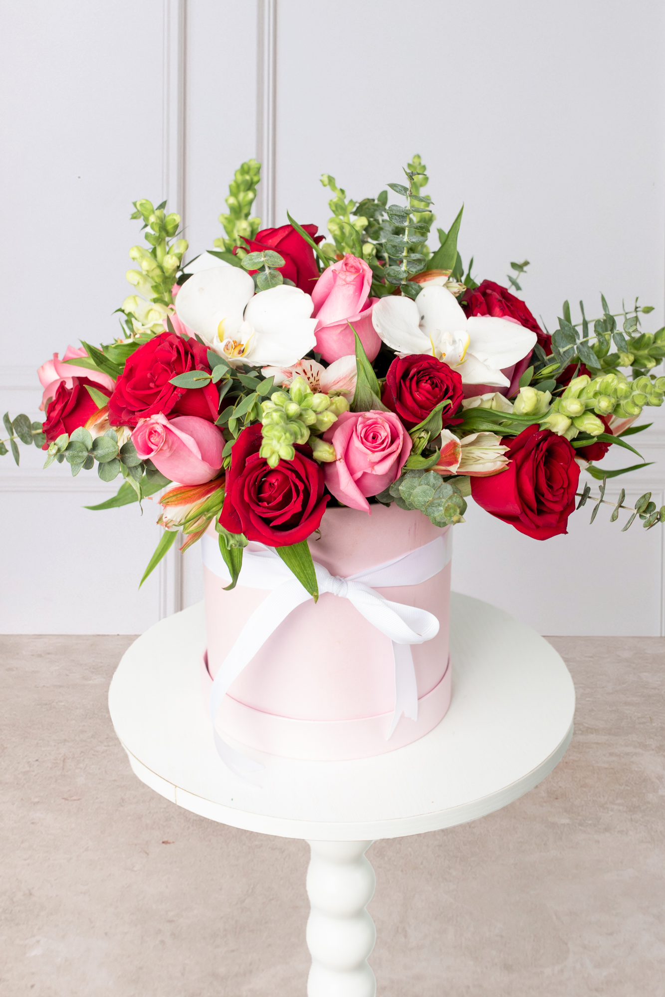 Destino es una elegante caja floral que combina la pasión de las rosas rojas, la ternura de las rosas en tonos suaves y el toque exótico y sofisticado de dos flores de orquídea.