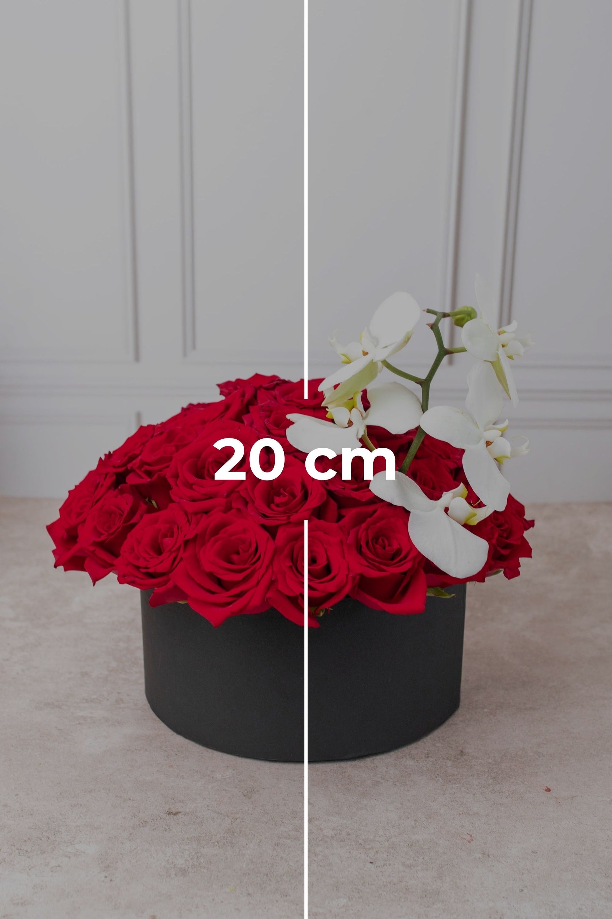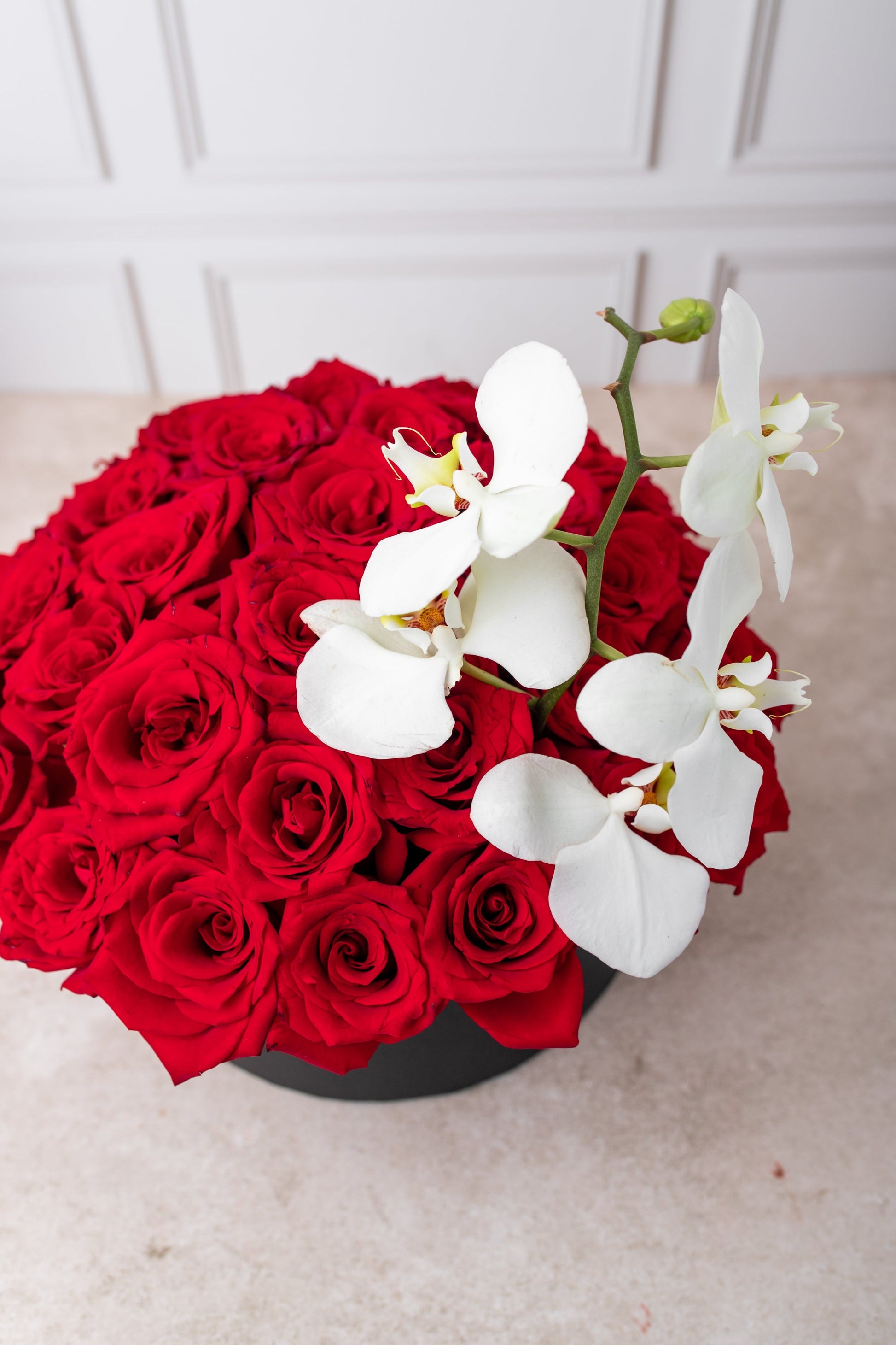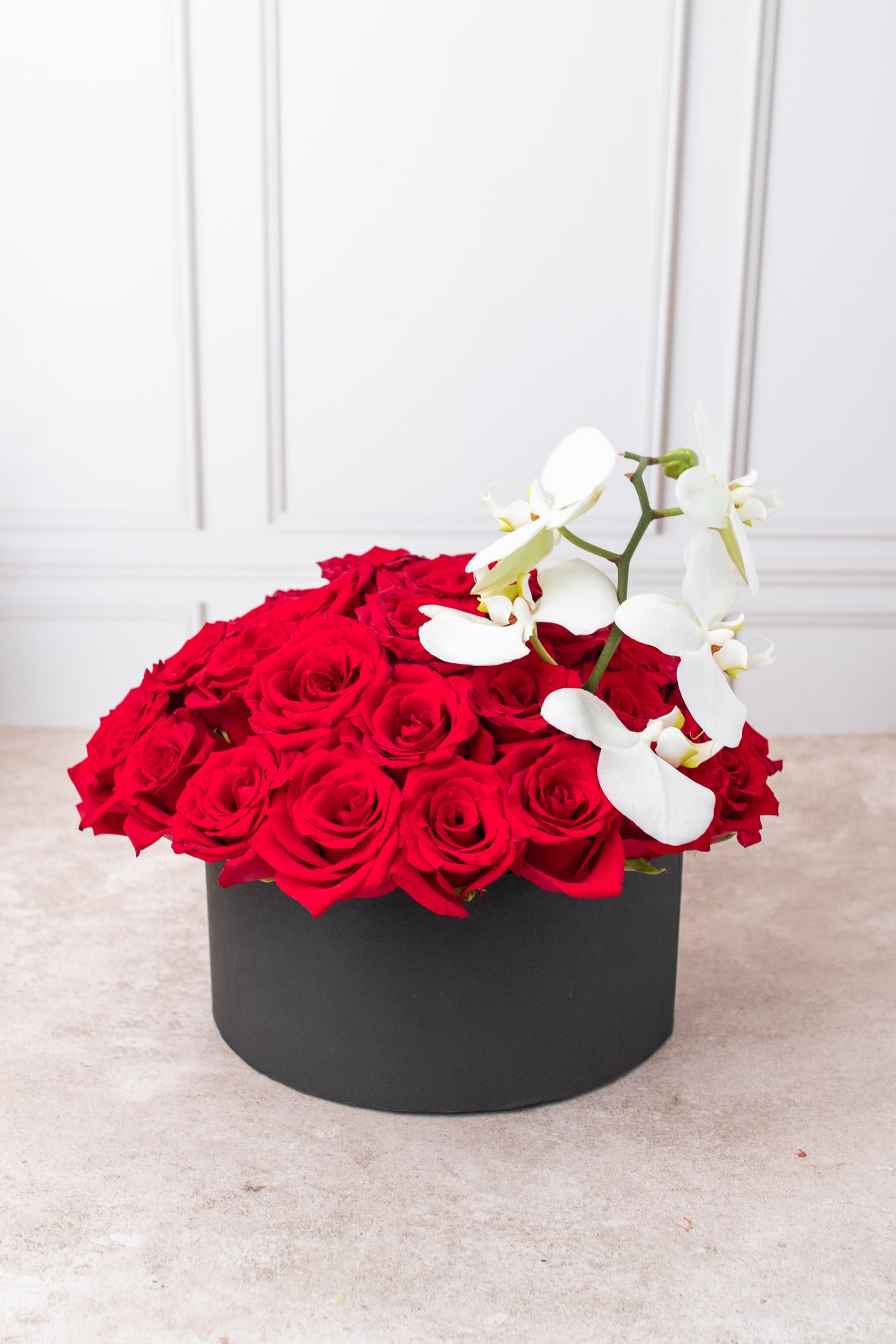 Este elegante arreglo floral dejará impresionado(a) a tu persona especial. Elaborado con rosas rojas y una orquídea blanca, este arreglo es una combinación perfecta que le dará un toque romántico a cualquier día.