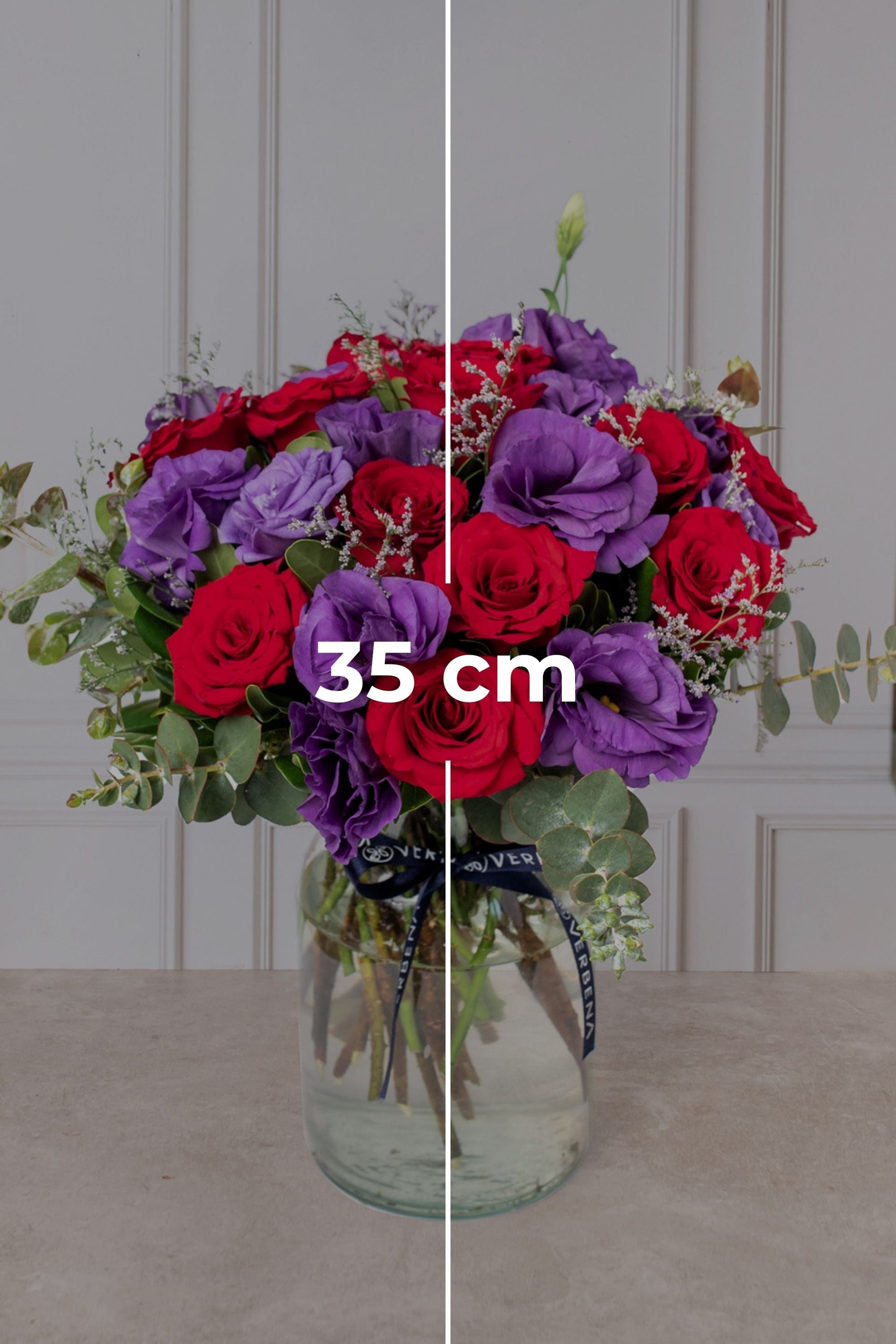 - Flores que contiene: Rosa Roja, Lisianthus Morado y Orquídea Morada