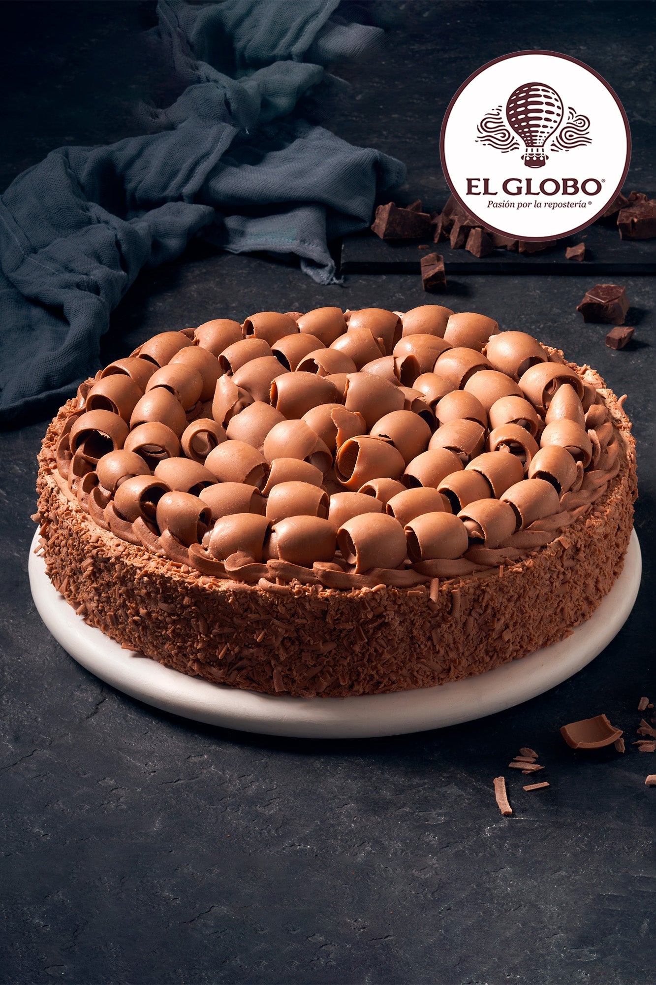 Único y original pastel de chocolate embebido con jarabe marrasquino, relleno de crema de chocolate y avellanas, decorado de exquisitos rizos de chocolate de leche elaborados artesanalmente.