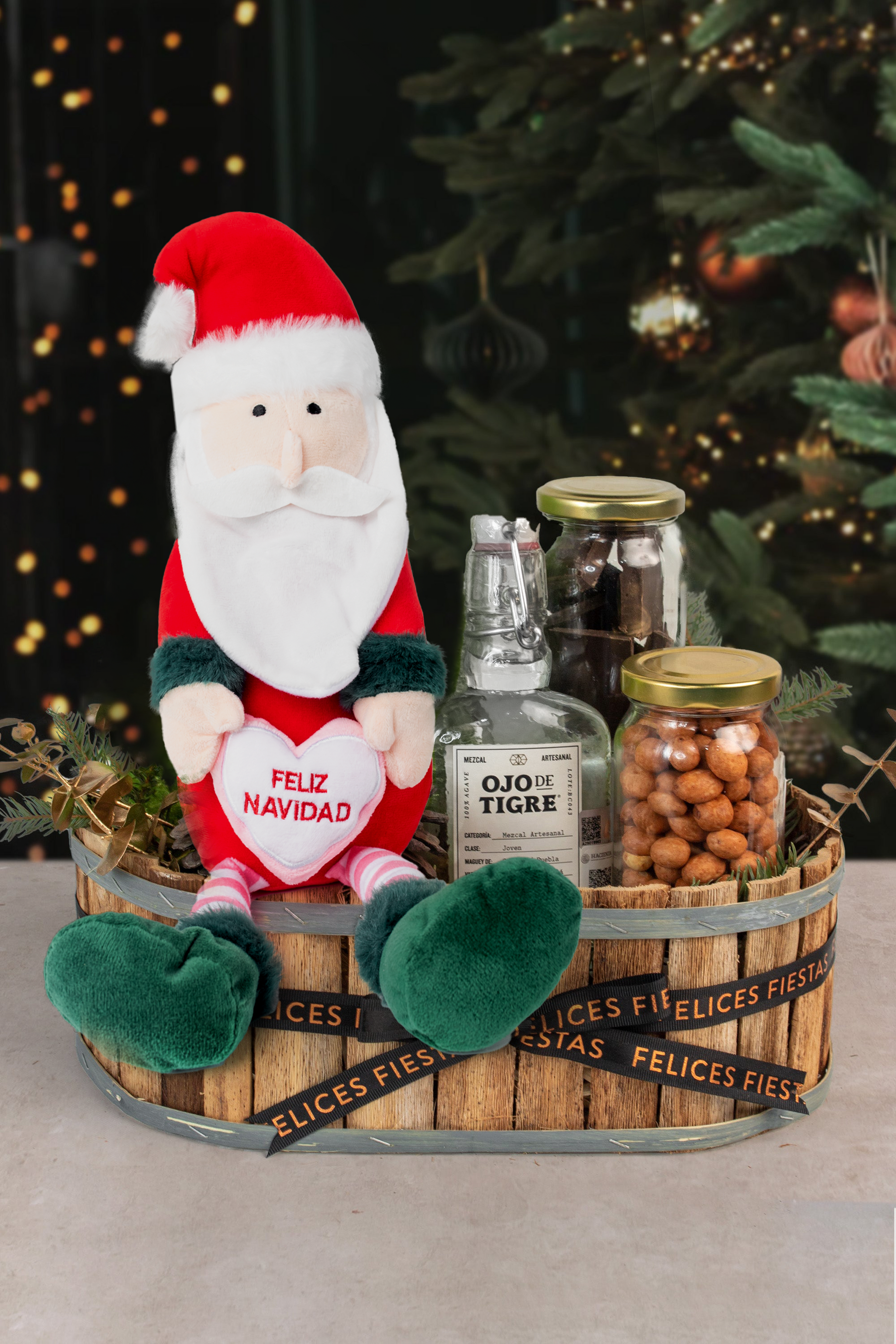 Peluche de Santa Claus, Mezcal Ojo de Tigre 200 ml, Cacahuates Japoneses y Ferrero Rocher