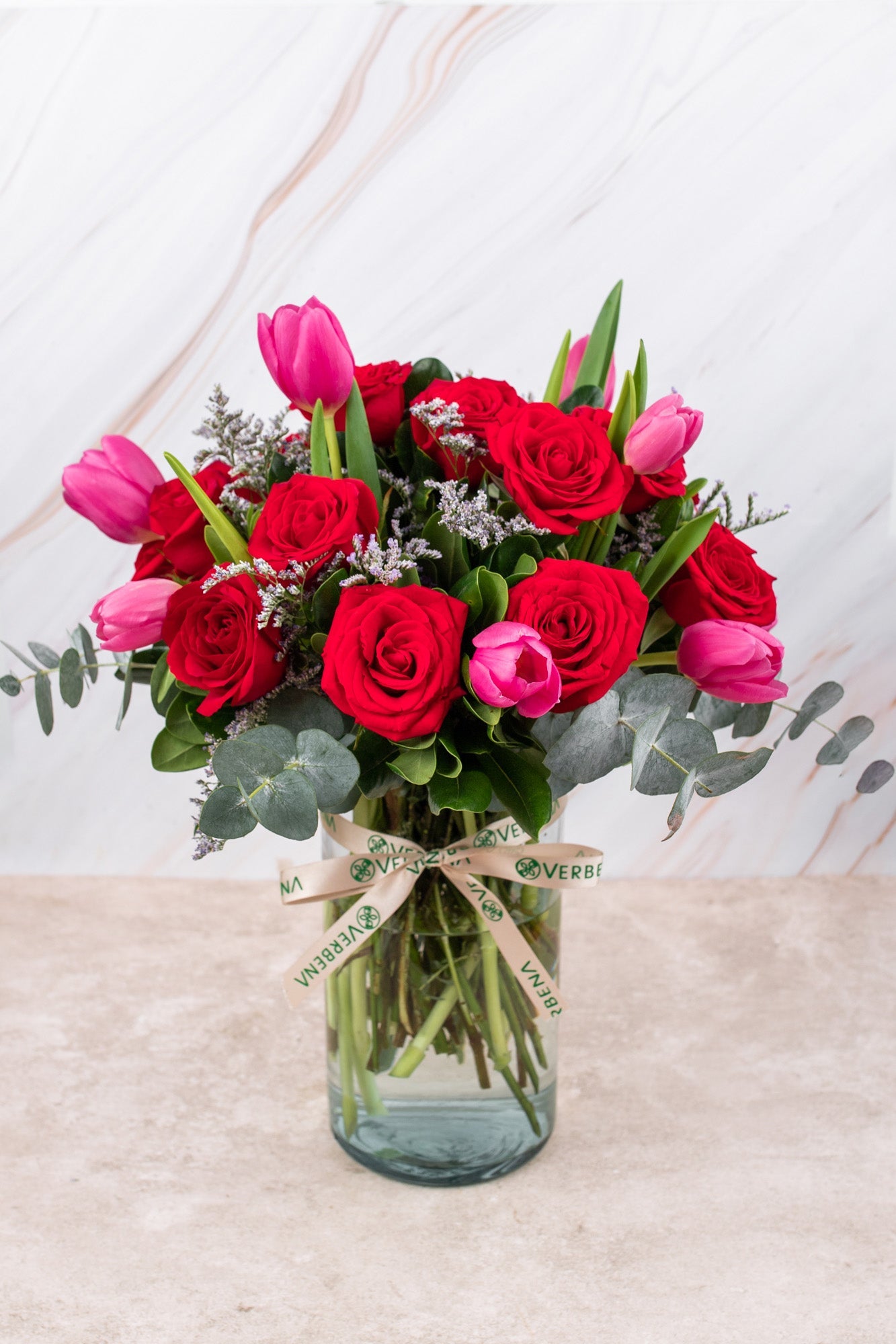 - Flores que contiene: Rosas Rojas, Tulipán Rosa, Dólar y Clavo Japonés.